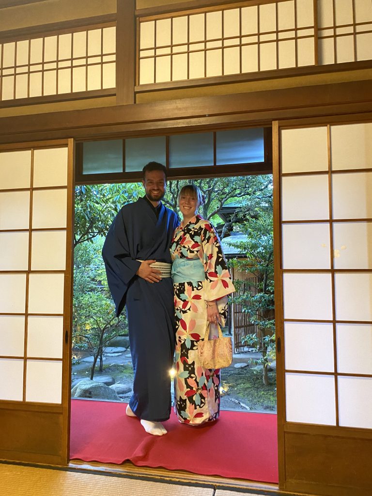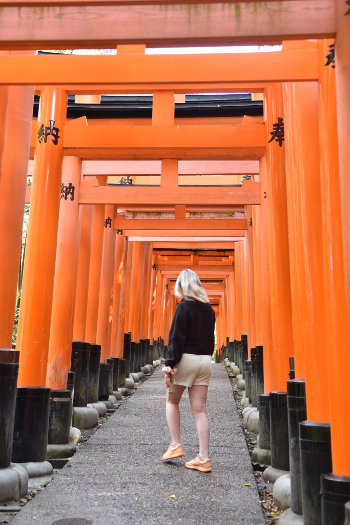 La journée suivante, un gros soleil, ciel bleu et températures avoisinant les 25 degrés nous ont permis d’explorer Kyoto sous un tout autre regard. Ce fut parfait pour la visite de Fushimi-inari, un imposant temple Shinto au bas du mont Inari. Nous avons fait une randonnée jusqu’au sommet, passant sous des milliers de Tori, portail d’un rouge orangêatre et indiquant l’entrée d’un site sacré shintoïste. La randonnée nous a permis d’avoir un beau panoramique sur Kyoto. Suite à cela nous avons visité Kiyomizu-Dera qui est (sans surprise encore) un autre temple bouddhiste. Malgré la quantité de temples, chaque visite est une expérience unique. Le Kiyomizu se situe dans le centre historique de Kyoto, Gion, où maisons en bois et ruelles étroites nous font replonger dans le temps. Les ruelles sannenzaka et ninenzakae sont les plus achalandées. Par la suite, nous avons marché dans Gion, visitant ici un temple avec une immense statue du Bouddha, là un parc municipal remplis d’écoliers et de kyotoïtes profitant de l’après-midi. Nous avions une cérémonie de thé prévue pour 17 heures et, pour l’occasion, nous étions vêtus de kimonos. Nous avons appris les rudiments et codes d’une cérémonie de thé en plus de bien apprendre à préparer le matcha. Ce fut toute une expérience immersive et unique qui clôturait très bien notre passage à Kyoto.