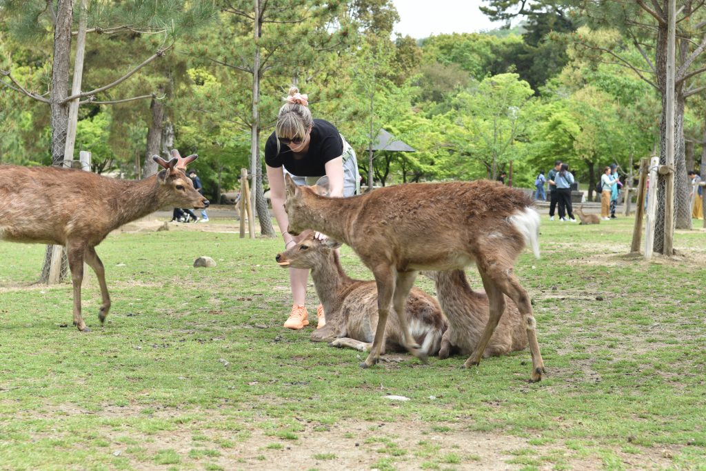 Notre prochain arrêt se fit à Nara où nous allions y passer une bonne partie de la journée pour y visiter le parc et les fameux daims qui s’y promènent librement. Dans la religion shinto, ces daims sont sacrés et il est interdit de les maltraiter ou les chasser. De plus, ces daims penchent leur tête et nous saluent lorsque nous passons et il est entendu de nous pencher en retour par signe de politesse. Le parc est aussi un lieu sacré et plusieurs temples s’y situent dont le Todai-ji y abritant un des plus grands Bouddhas en bronze du monde. Le parc est assez grand et il y ait agréable de s’y balader plusieurs heures. De Kyoto, on peut s’y rendre en 45 minutes et des trains s’y rendent régulièrement.