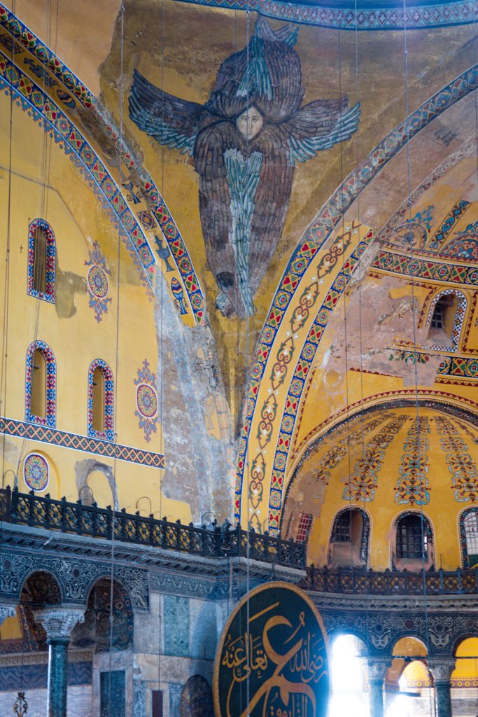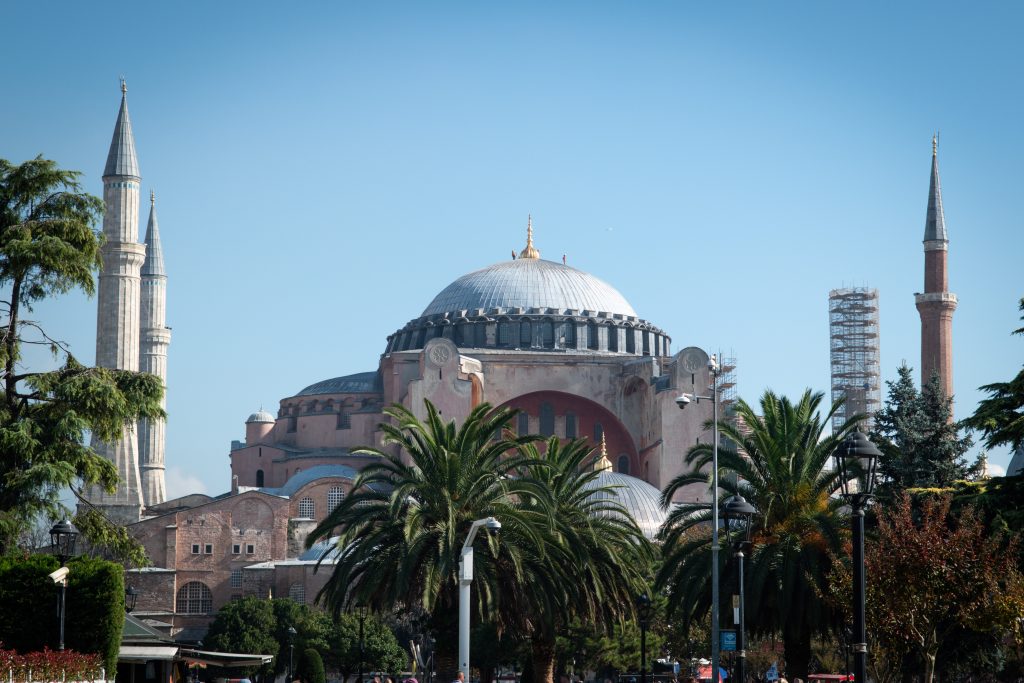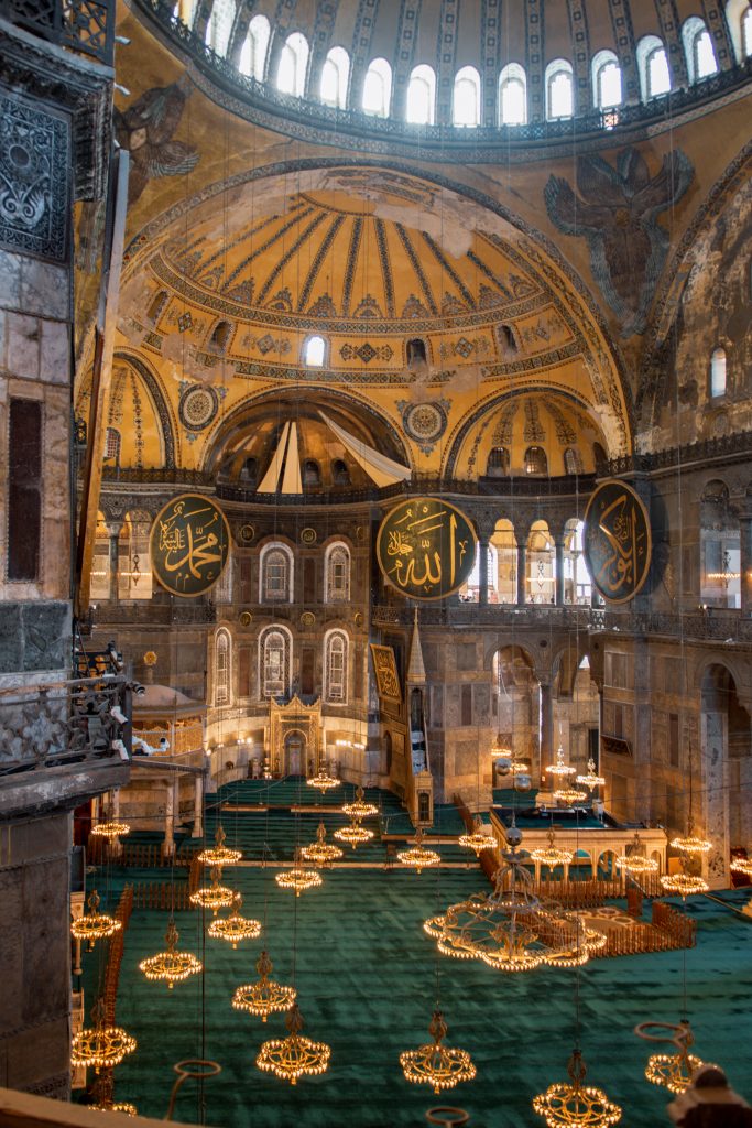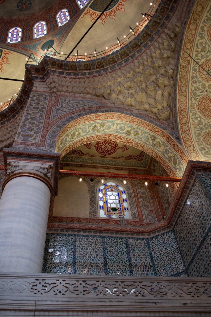 Construite au IVe siècle après J-C, cette Église byzantine fut agrandie au Vie siècle et fut un symbole marquant de Constantinople jusqu’à sa conquête par les Ottomans. Le Sultan Mehmet II la convertit en Mosquée, statue qu’elle conserva jusqu’au 20e siècle. Elle devient musée jusqu’en 2020 avant qu’Erdogan, actuel président de la Turquie, décida de la rendre Mosquée à nouveau. Et depuis janvier 2024, un prix de 25 euros par personne pour les touristes fut instauré. Habituellement les mosquées sont ouvertes à tous à l’extérieur des heures de prières sans frais, donc cette politique est directement visée vers les touristes. Ce fut impressionnant néanmoins de rentrer dans ce lieu historique, mais nous avions accès qu’au 2e étage de la Sainte-Sophie, la place de prière au rez-de-chaussée étant réservée pour la prière. La mosquée est très belle de l’extérieur, donc jugez si vous voulez visiter l’intérieur selon vos désirs.