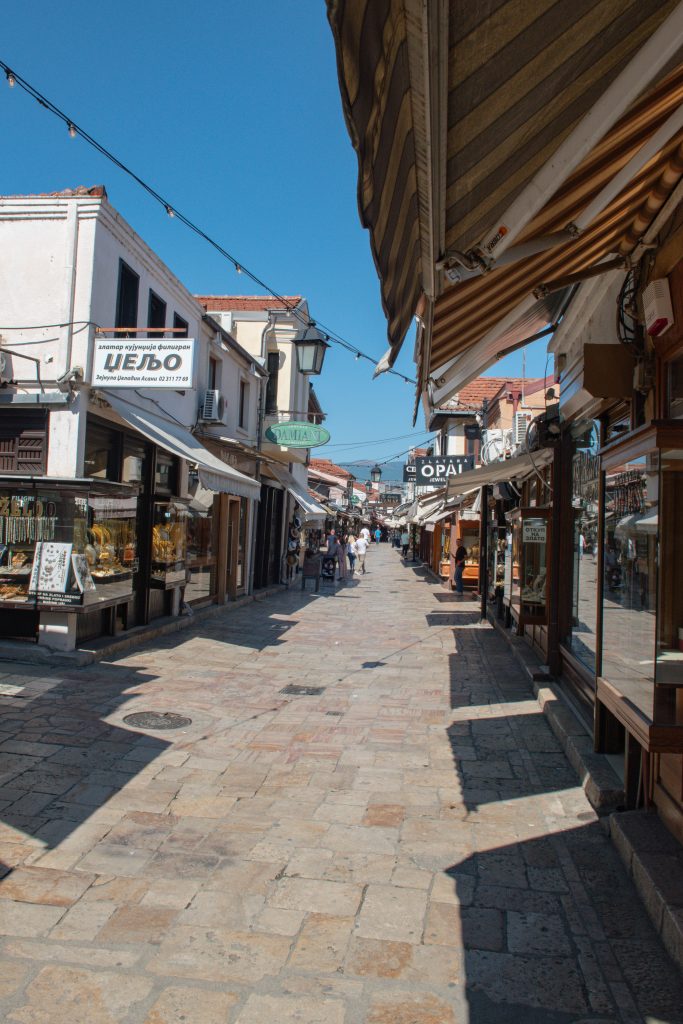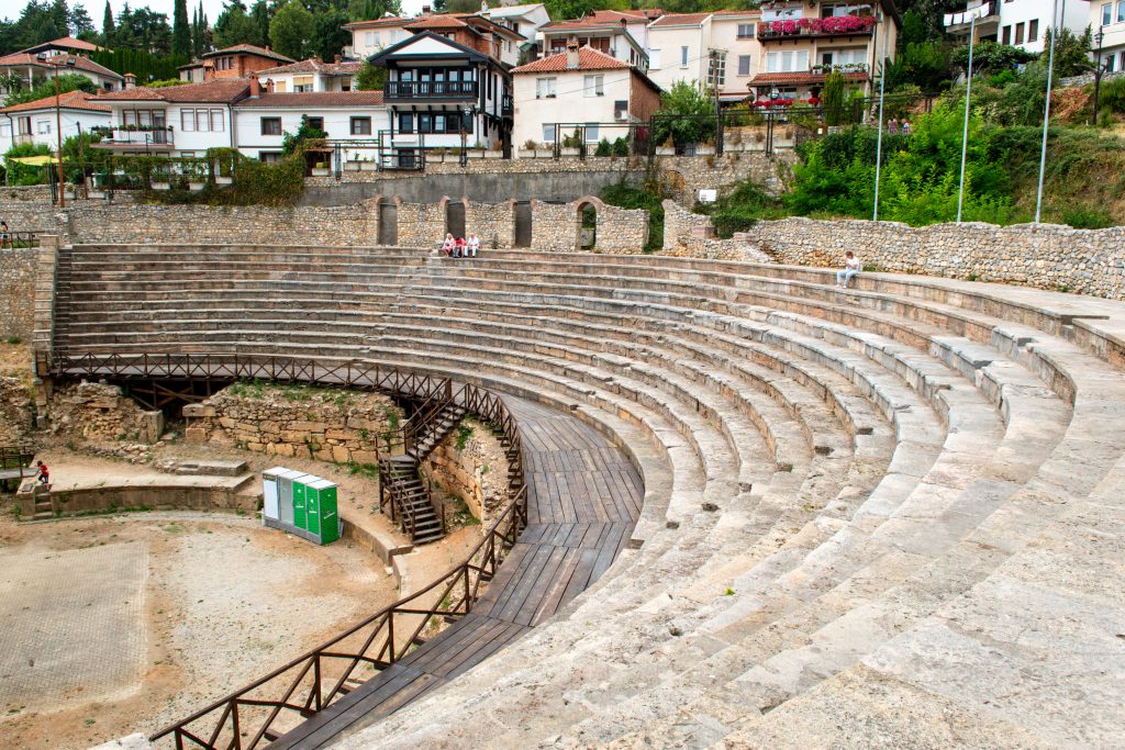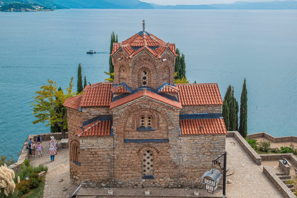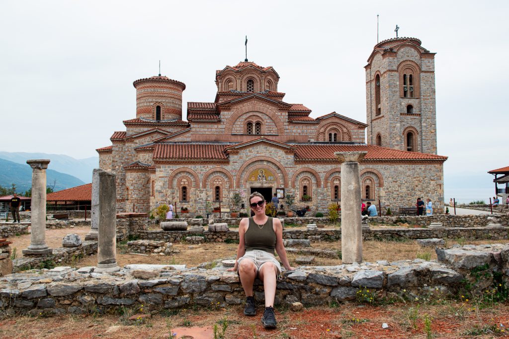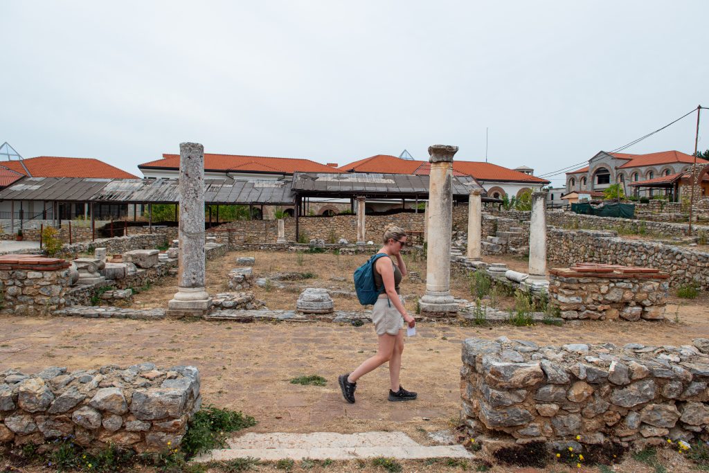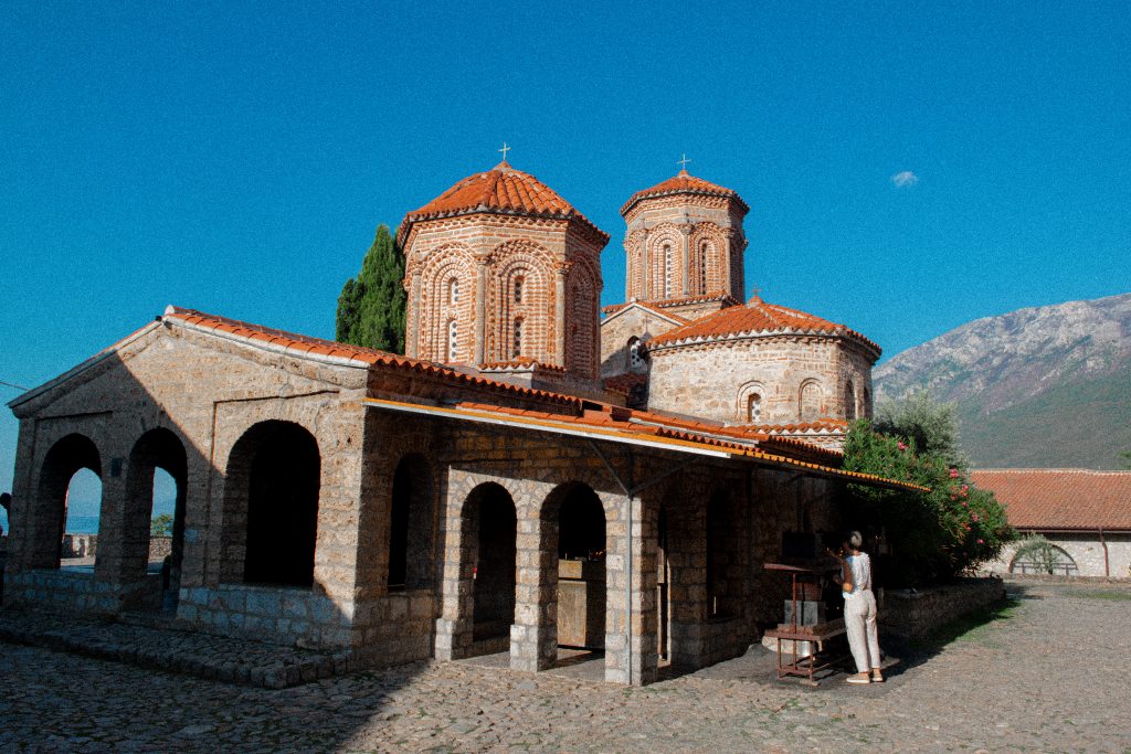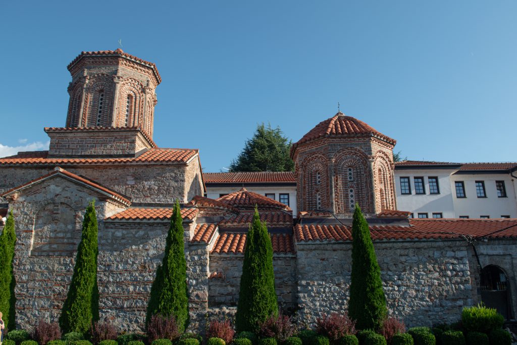 Notre première journée de visite de la ville commença avec l’ascension de la colline surplombant la ville. Cette marche nous a permis plusieurs panoramiques de la ville et du lac. Le chemin permet aussi d’accéder à l’Église Saint-Jean de Kaneo, église orthodoxe emblématique de la Macédoine du Nord et d’un style architectural impressionnant. Nous avons par la suite atteint la Cathédrale Sainte-Sophie d’Ohrid avant de longer la rive jusqu’à atteindre la place principale de la ville et la rue menant au vieux bazar. Nous en avons profité pour acheter quelques lokoums turcs ainsi que des mélanges de thé dont un contre les douleurs au ventre. Par la suite, nous avons visité la vieille ville fortifiée et le théâtre antique d’Ohrid datant d’avant Jésus-Christ. Et avant d’aller relaxer sur une plage, nous avons fait un détour vers le monastère Saints-Clément-et-Panteleimon pour y admirer une autre Église d’architecture byzantine construite au Xe siècle.