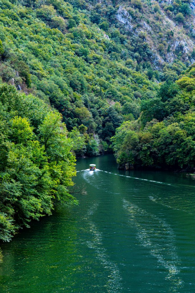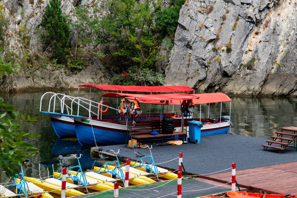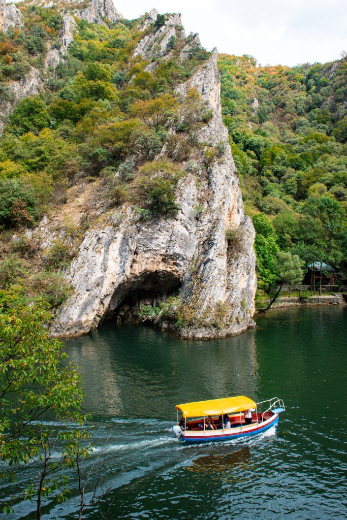 Nous avons repris la route pour le canyon de Matka qui se situe en banlieue de Skopje. Ce canyon abrite un barrage hydroélectrique et un lac artificiel sur lequel il est possible d’y faire des tours de bateaux, du kayak ou tout simplement longer celui-ci en empruntant un sentier de randonnée. Nous avons décidé de nous délier les jambes en suivant le sentier, mais conseillons de plutôt faire l’excursion en bateau car elle permet d’atteindre et visiter la grotte de Vrelo, ou les deux si le temps le permet. Il était déjà temps de remettre la voiture, nous installer dans notre hébergement et explorer un peu le bazar de Skope où nous avons mangé turc et bu pour la première fois (et définitivement pas la dernière) du Ayran, boisson de lait ou yaourt fermentée.