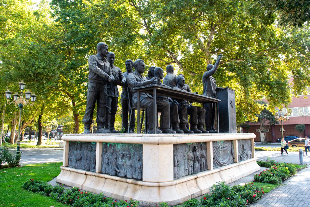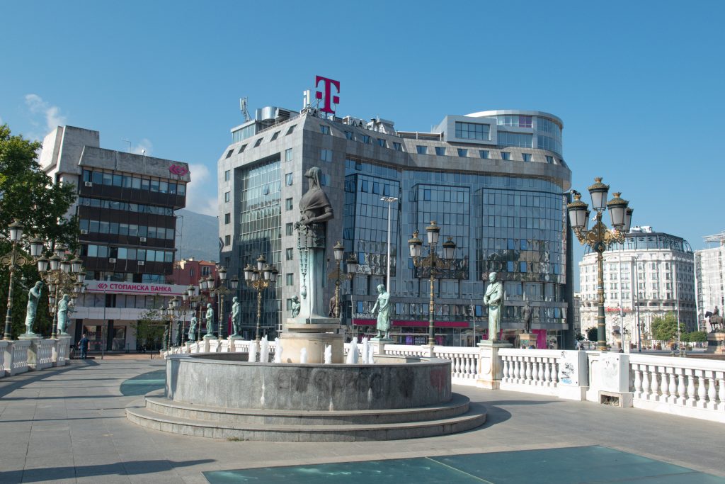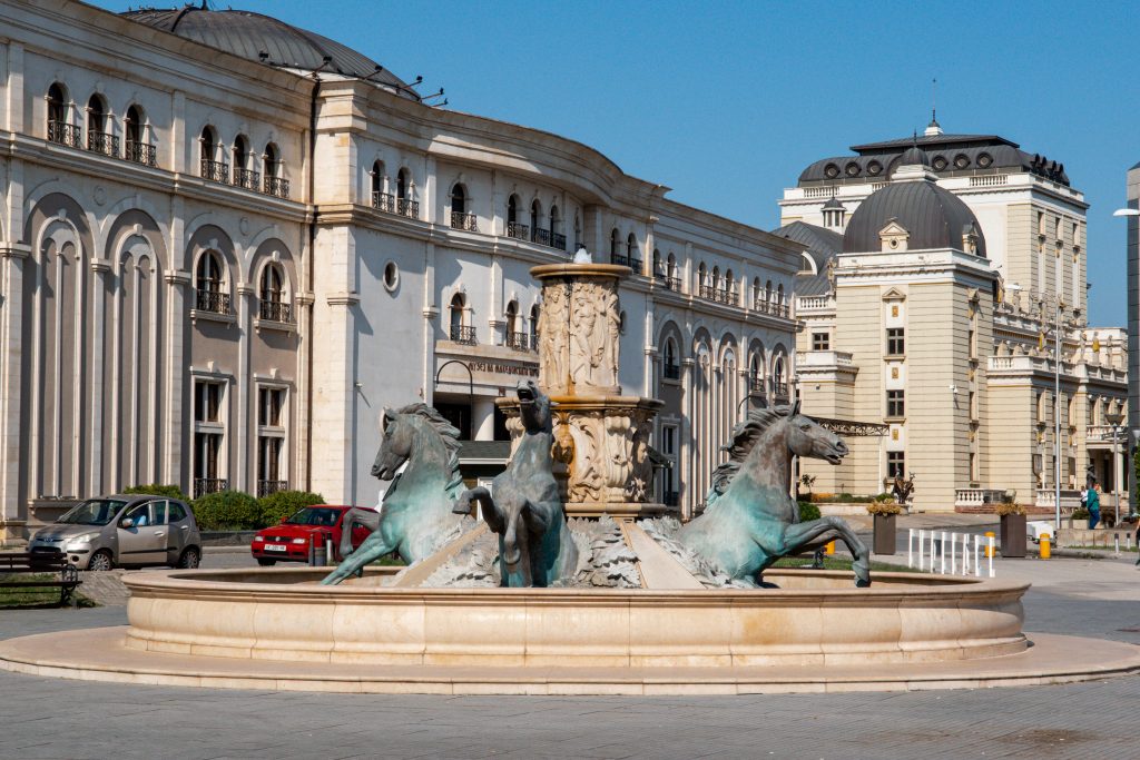 Nous avons aussi appris que la ville de Skopje a connu plusieurs tremblements de terres dans son histoire, le plus récent en 1963 qui détruisit près de 80% de la ville en plus de causer la mort d’un millier de résidents. Mère Teresa, qui est d’ailleurs née à Skopje, mais dont sa maison et son église où elle a trouvé la foi ont été détruits durant ce tremblement de terre, a usé de son influence pour braquer les projecteurs sur sa ville. Les plans de la reconstruction s’est faite par l’architecte japonais Kenzo Tange, le même qui a construit le parc du Mémorial de la Paix et le musée de la bombe atomique à Hiroshima. Plus récemment, le maire de la ville a lancé le projet Skopje 2014, plan d’urbanisme visant à rendre la capitale plus imposante en y construisant monuments architecturaux et sculptures. Ceci donne un aspect tout à fait particulier à cette capitale, traversant ici un pont avec des statues représentant les artistes célèbres de la Macédoine du Nord, là une fontaine géante sur laquelle trône Alexandre le Grand à cheval, ou encore cette fontaine montrant Alexandre le Grand et sa mère à plusieurs stades de sa jeunesse. Dernier point sur le tremblement de terre, on peut voir l’horloge de la vieille gare qui s’est arrêté à ce moment et qui depuis, sert de rappel à cet événement tragique.