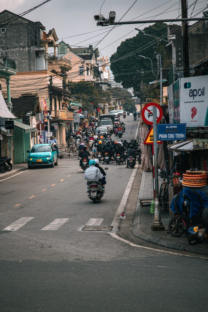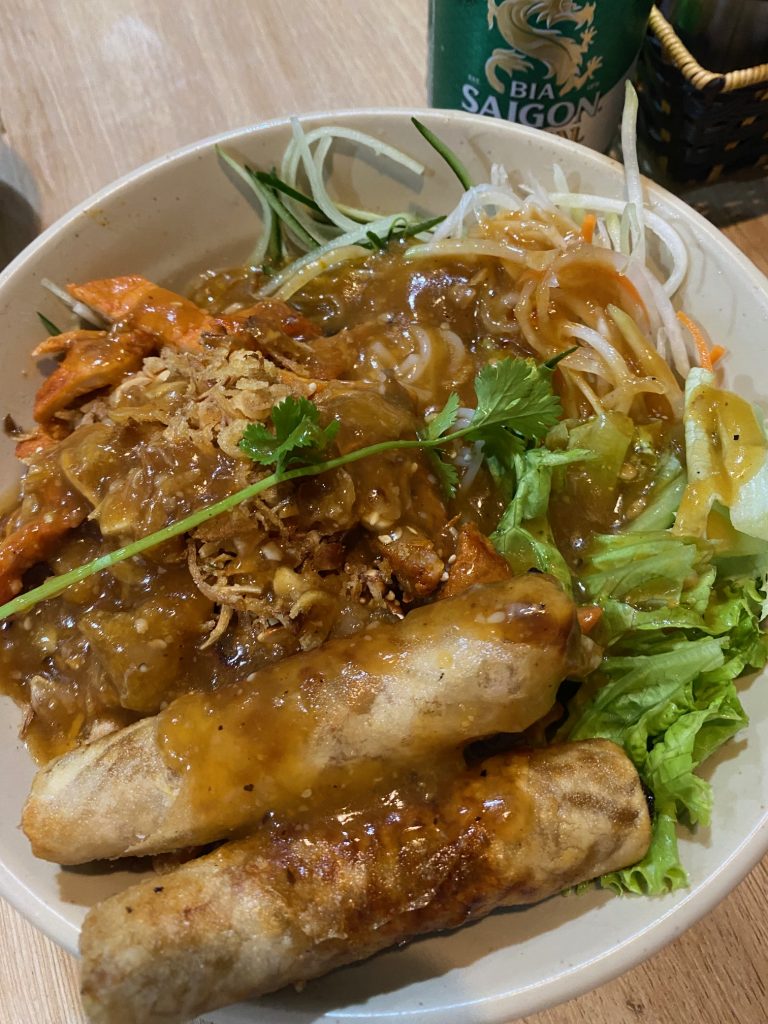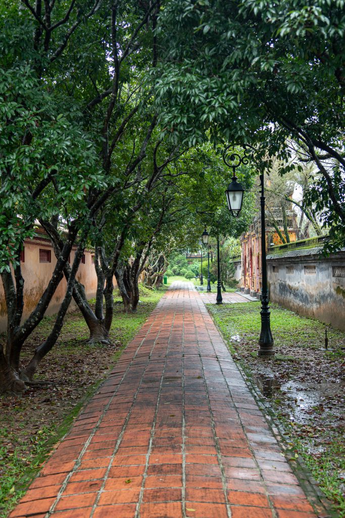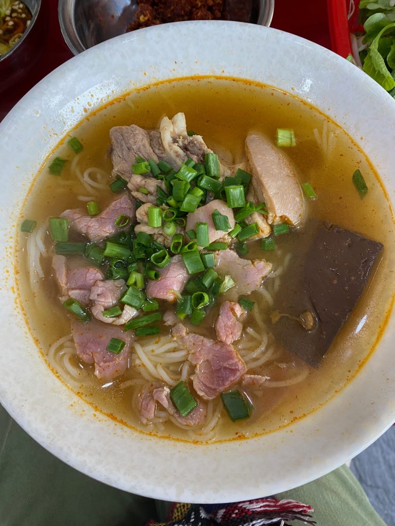 Nous avons rejoint Hué en milieu de journée après un trajet de plus de 3 heures d’Hoi An. Une fois notre hébergement trouvé, nous nous sommes restaurés dans un petit restaurant de quartier offrant plusieurs mets locaux. Hué est reconnu comme la ville gastronomique du Vietnam. Plusieurs plats typiques y trouvent leur origine et nous nous sommes régalés tout le long de notre séjour dans cette ville. Parmi ces plats traditionnels, notons le Bun Bo Hue, soupe repas à la pho mais dont le bouillon de bœuf est plus relevé, les nems ou encore un bol de vermicelles avec porc et sauce aux arachides. Hué est aussi réputé pour son café salé, ou Ca phe Muoi, le sel venant rehausser la saveur du café. Malgré le temps plus gris et pluvieux lors de notre passage, nous avons pu trouver du réconfort dans ces différents plats tous plus savoureux les uns que les autres.