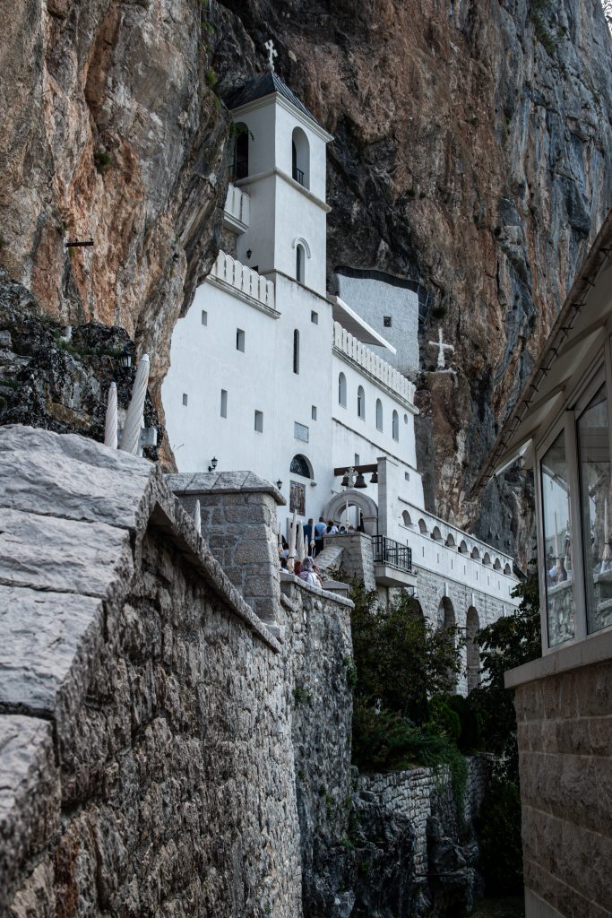 Notre séjour dans le Durmitor tirait déjà à sa fin et il nous fallait déjà reprendre la route pour nous rendre jusqu’à Virpazar, village principal aux abords du lac Skoder. Nous allions aussi profiter de cette journée de déplacement pour nous arrêter visiter Podgorica, capitale du Monténégro. Cependant, nous avions aussi rajouté un arrêt de dernière minute la veille, le Monastère d’Ostrog. Grave erreur. Ce qu’il faut savoir de ce monastère est qu’il est encore aujourd’hui un des lieux de pèlerinages les plus visités des Chrétiens Orthodoxes. En effet, les reliques qui s’y trouvent, de Saint-Basile d’Ostrog seraient reconnues pour faire des miracles, d’être guéris miraculeusement. N’ayant plus ou moins été au courant de cette information, nous avons décidé de nous y rendre, un dimanche de surcroît, en pensant voir le monastère encastré dans la falaise et repartir pour la capitale par la suite. Tout d’abord, la route montagneuse pour se rendre jusqu’au dit monastère ne fut pas des plus évidentes, en plus du fait qu’elle fut fort achalandée. Une fois la voiture stationnée, il a fallu monter plusieurs marches avant d’atteindre le monastère, et ensuite faire la file pour rentrer. Ce ne fut qu’une vingtaine de minutes plus tard que nous avons compris que la file était pour aller embrasser la relique de Saint-Basile et non pas pour rentrer dans le monastère. Néanmoins, il était impressionnant de voir les fresques murales dessinées à même la roche de la montagne et le lieu, il faut le dire, dégage une certaine aura.