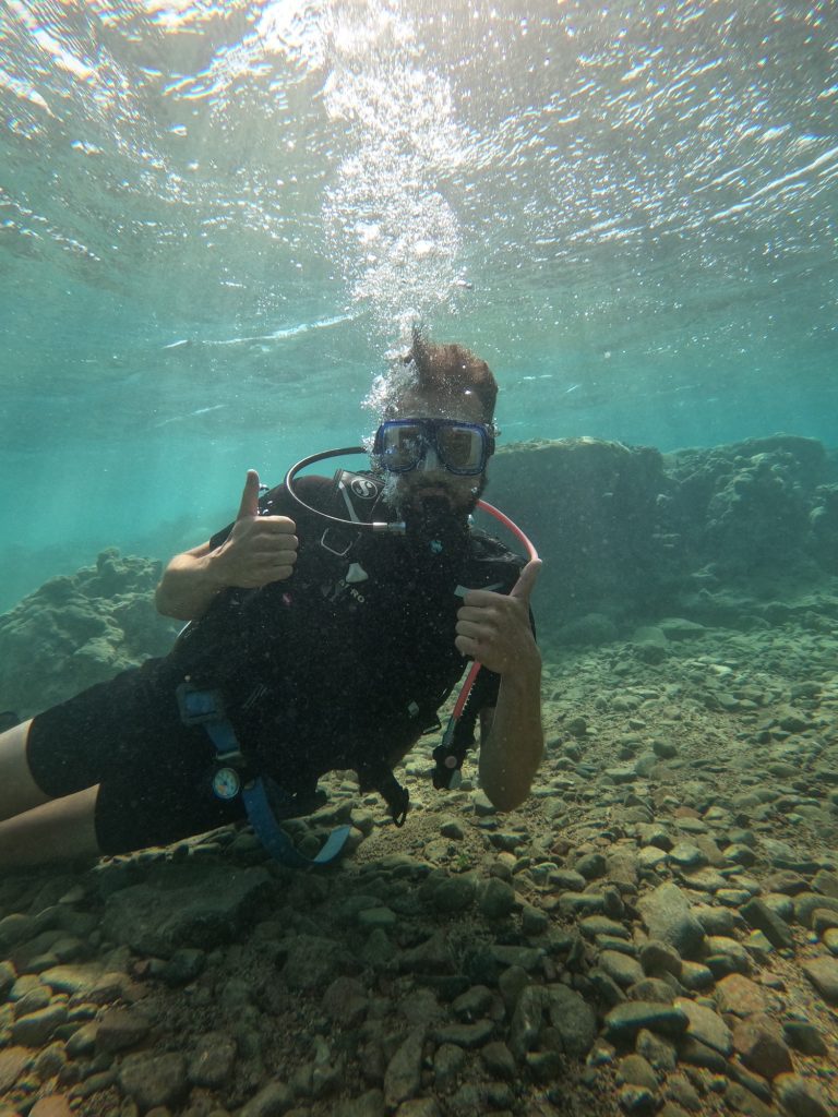 Nous nous sommes présentés au centre de plongée à 10 heures le lendemain pour rencontrer nos instructeurs et choisir notre équipement de plongée. Chacun avait son instructeur et, contrairement aux expériences de plongée précédente de Chanel, l’entrée à l’eau se fit directement de la plage vers la mer avec palmes dans les pieds. Chanel a pu explorer un tank coulé, des récifs de coraux où beaucoup de poissons se trouvaient ainsi qu’une épave d’avion qui fut elle aussi coulée pour les plongeurs. Ce qui fut intéressant fut le fait qu’à la suite d’une tempête, l’épave d’avion fut scindée en trois et il fut possible pour Chanel de rentrer dans le cockpit de celui-ci. Jan accompagnait son instructeur et a pu descendre jusqu’à 10 mètres de profondeur et explorer le tank et des récifs de coraux. Il existe plus d’une dizaine de sites d’exploration, terrain de jeu idéal pour les plongeurs qui veulent s’y rendre.