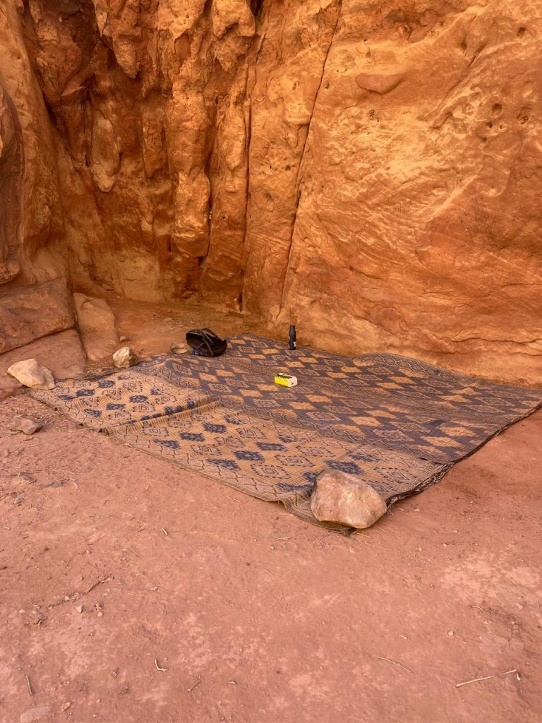 Une fois la randonnée terminée, un dîner préparé par les bedouins nous attendait et nous l’avons englouti tellement c’était bon. Il était temps de nous séparer du groupe et continuer notre journée dans le désert avec Ahmed. Nous avons continué notre exploration du Wadi Rum et ce fut une autre journée parfaite à admirer la beauté des paysages. Heureusement pour notre deuxième nuit, il n’avait aucun vent et nous avons pu camper à un endroit plus a découvert avec vue sur des dunes rouges. La soirée s’est terminé autour du feu à discuter avec Ahmed et boire plusieurs tasses de thé.